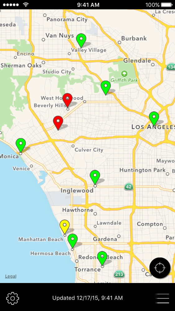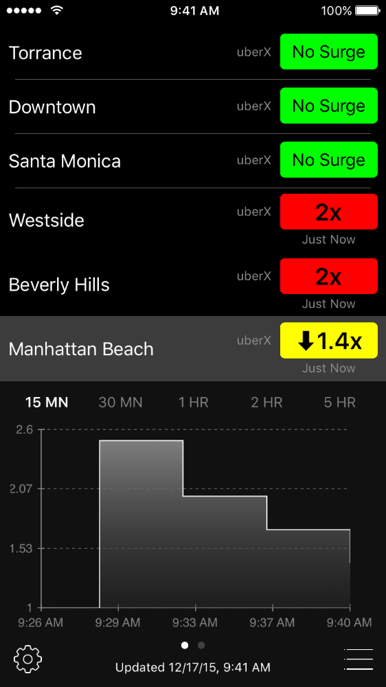 Surge data for all your locations is presented in an easy to read list, with color-coded surges, allowing to you check for surges at a quick glance.